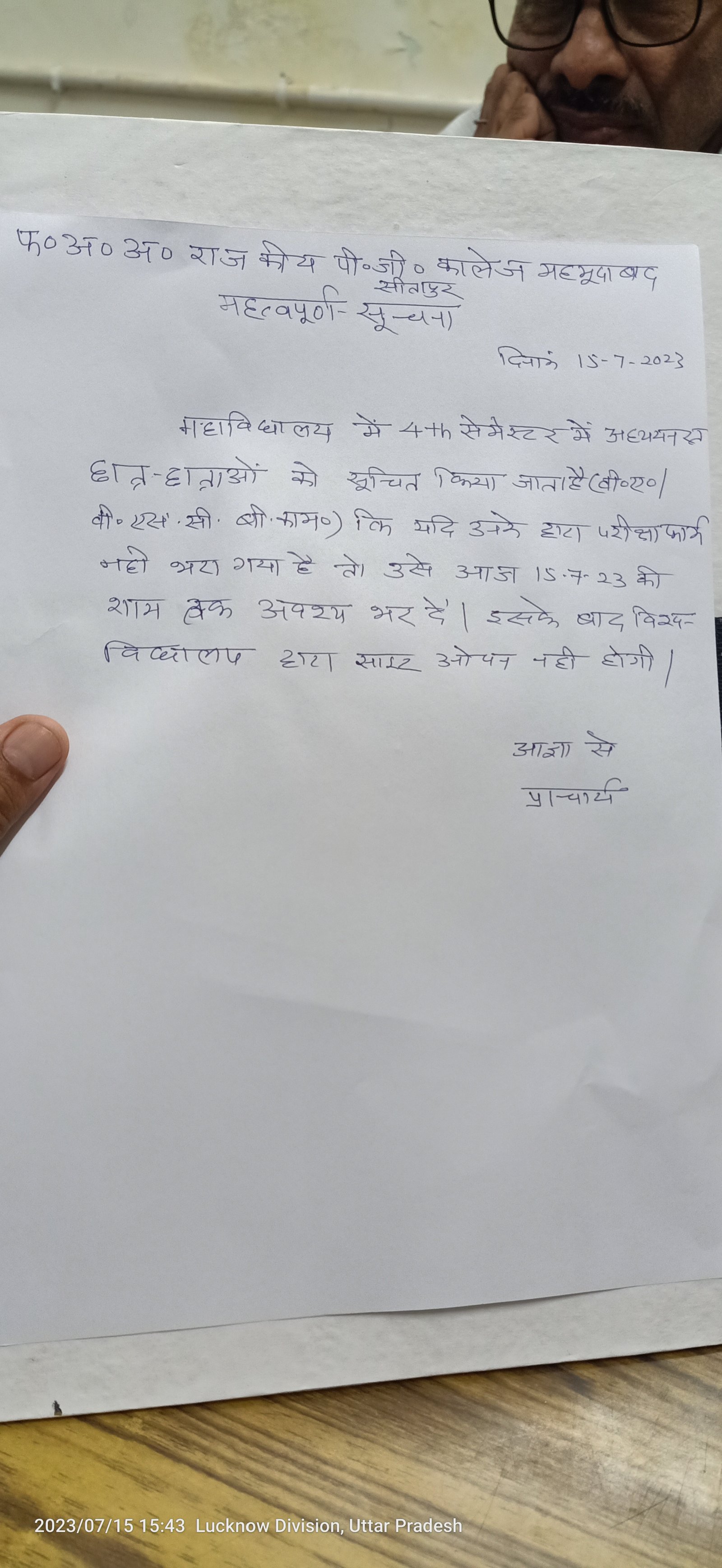 Notice Regarding Exam Form for Fourth semester