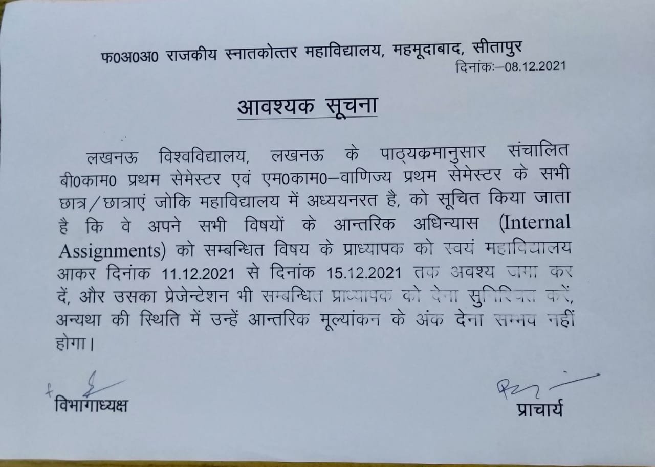 बी० कॉम० प्रथम सेमेस्टर एवं एम० कॉम० प्रथम सेमेस्टर के असायनमेंट के सम्बन्ध में