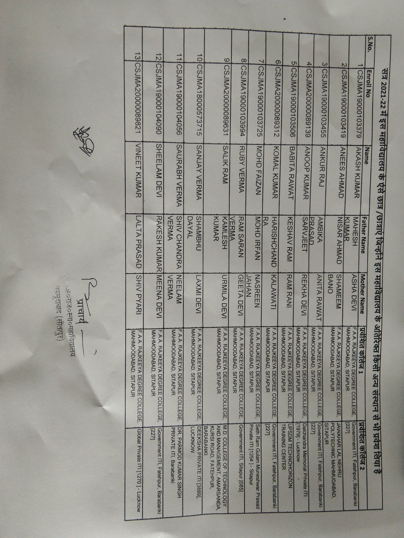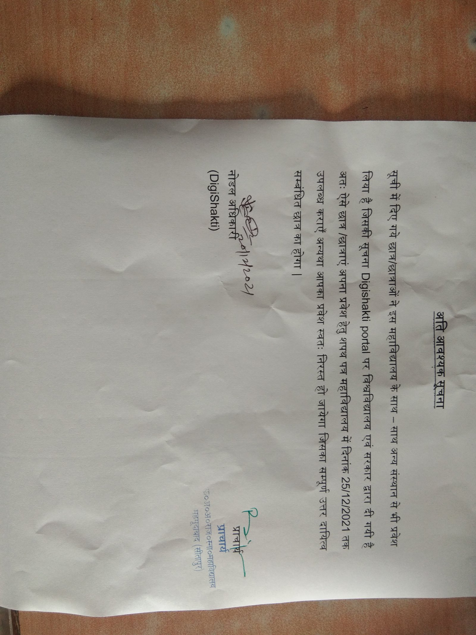 सूची में दिए गये छात्र/छात्राओं ने इस महाविद्यालय के साथ – साथ अन्य संस्थान से भी प्रवेश लिया है जिसकी सूचना Digishakti portal पर विश्वविद्यालय एवं सरकार द्वारा दी गयी है अतः ऐसे छात्र /छात्राएं अपना प्रवेश हेतु शपथ पत्र महाविद्यालय में दिनांक 25/12/2021 तक उपलब्ध कराएँ अन्यथा आपका प्रवेश स्वतः निरस्त हो जायेगा जिसका सम्पूर्ण उत्तर दायित्व सम्बंधित छात्र का होगा |