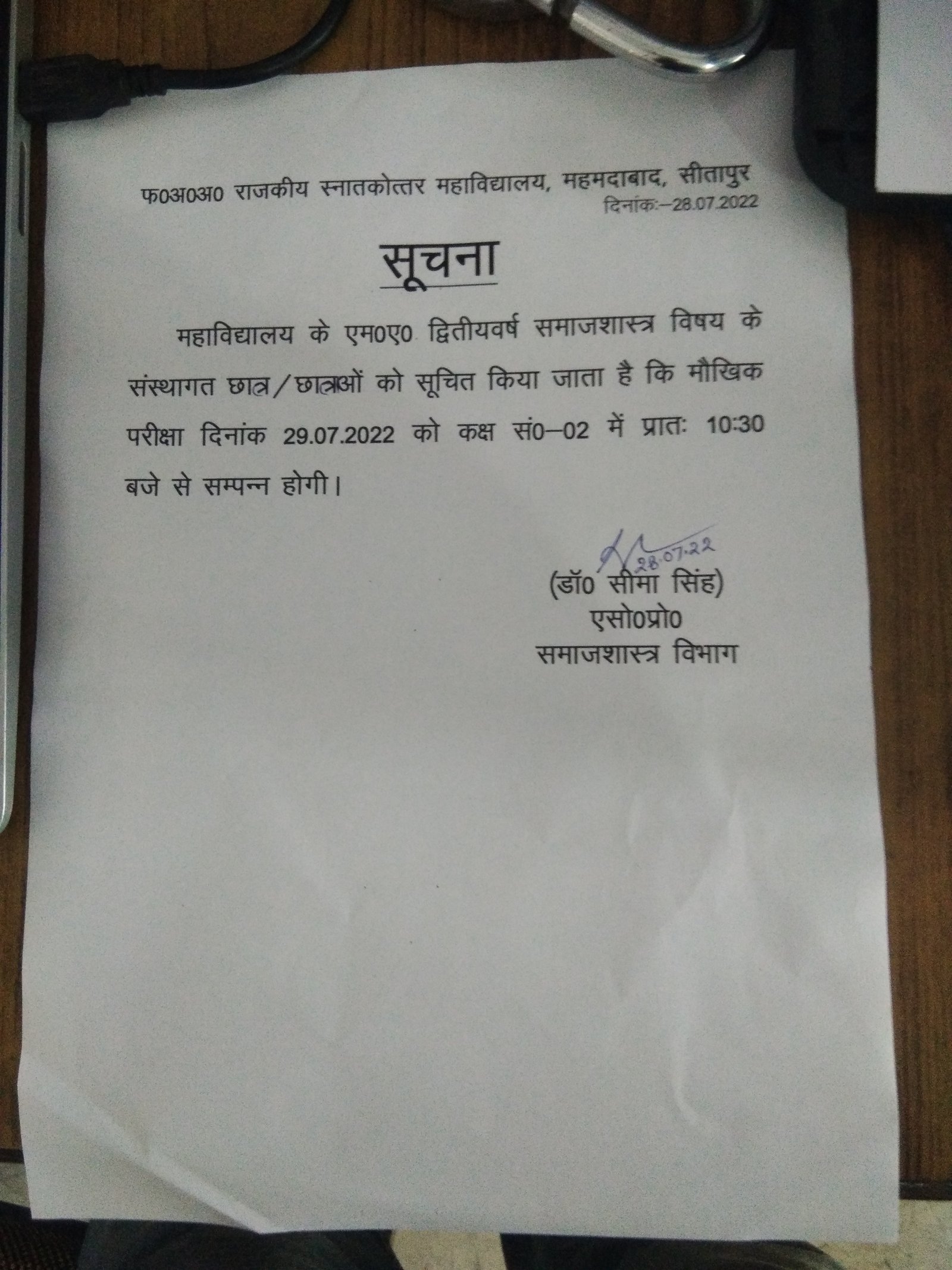 म० ए ० द्वितीय वर्ष समाज शात्र के मौखिकी के सम्बन्ध में