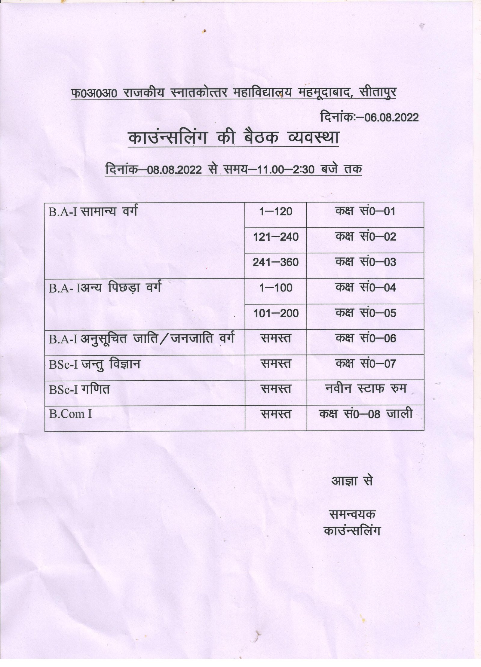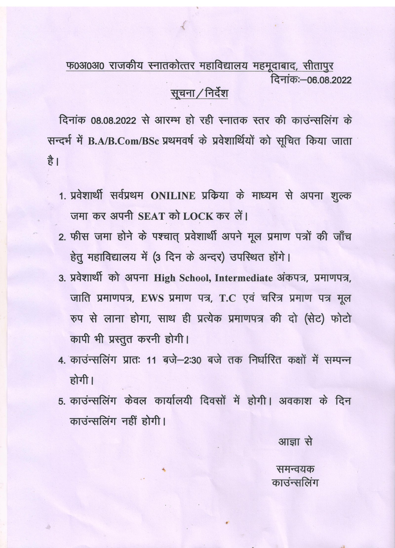 स्नातक प्रथम वर्ष के प्रवेश हेतु काउन्सलिंग सम्बन्धी नियम