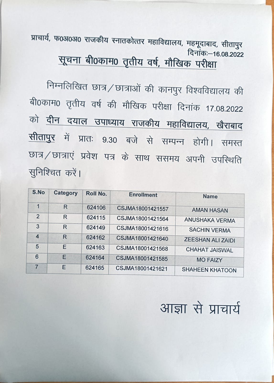 बी० कॉम० तृतीय वर्ष के मौखिकी के सम्बन्ध में