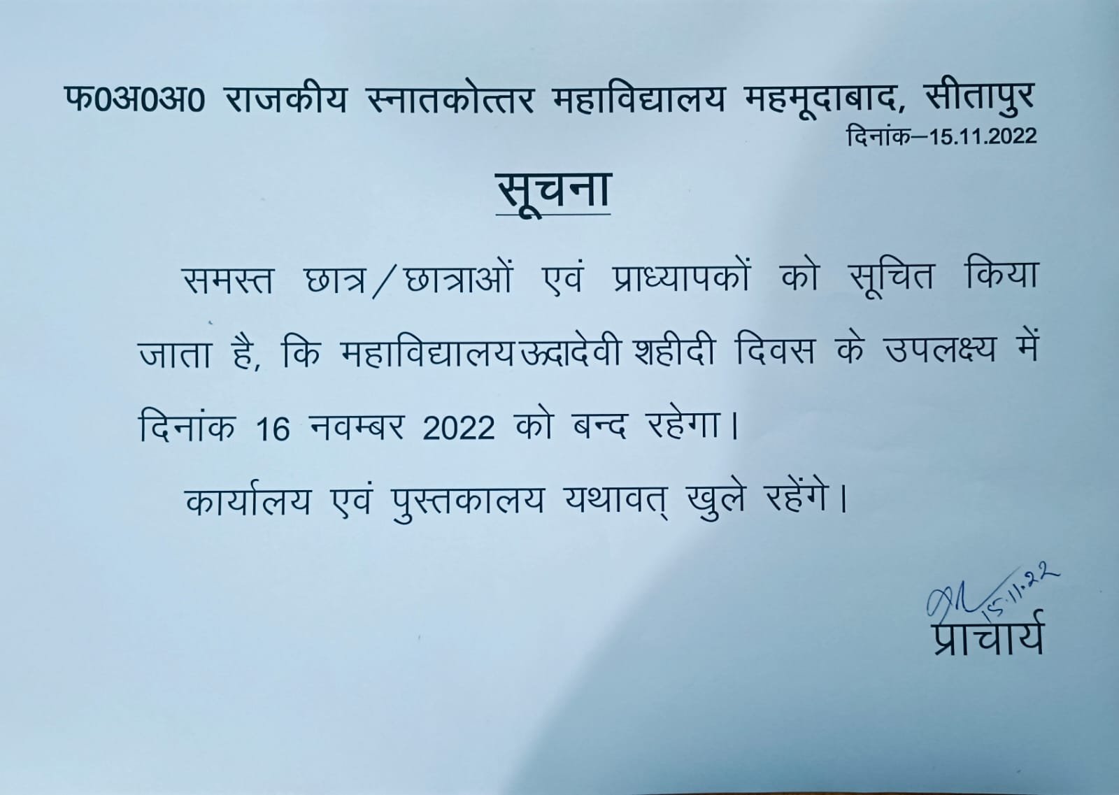 Holiday Notice of dated 16.11.2022