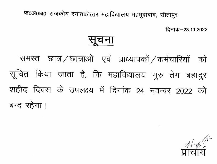 दिनांक 24/11/2022 के अवकाश के सम्बन्ध में